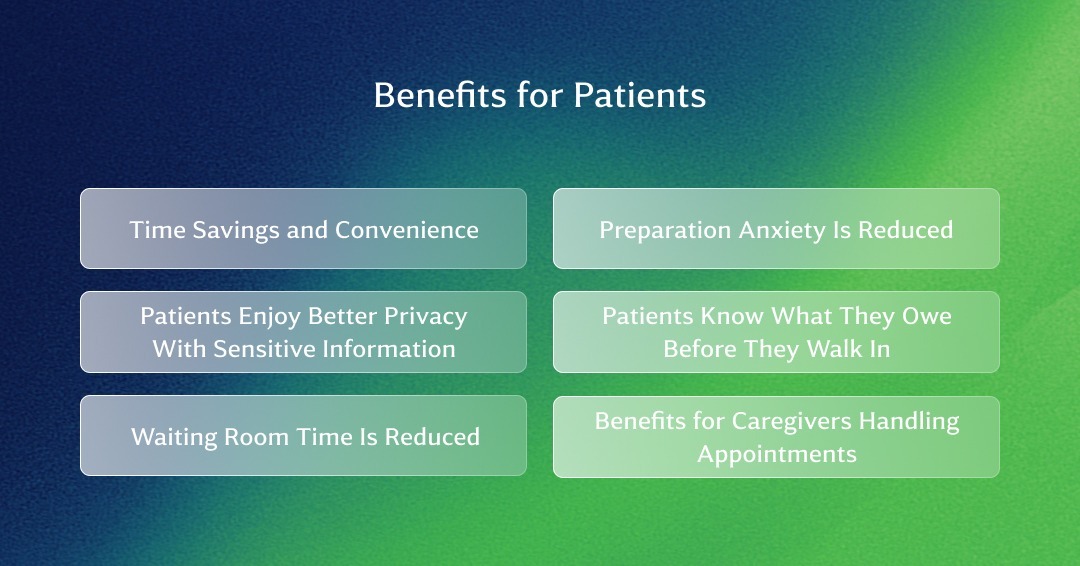 Every patient who fills out a form in a waiting room wishes they could have done it at home. Digital check-ins offer exactly that. Patients can complete them on their phones whenever it suits them. There's no pressure from people watching because you need more time to fill out all the fields.