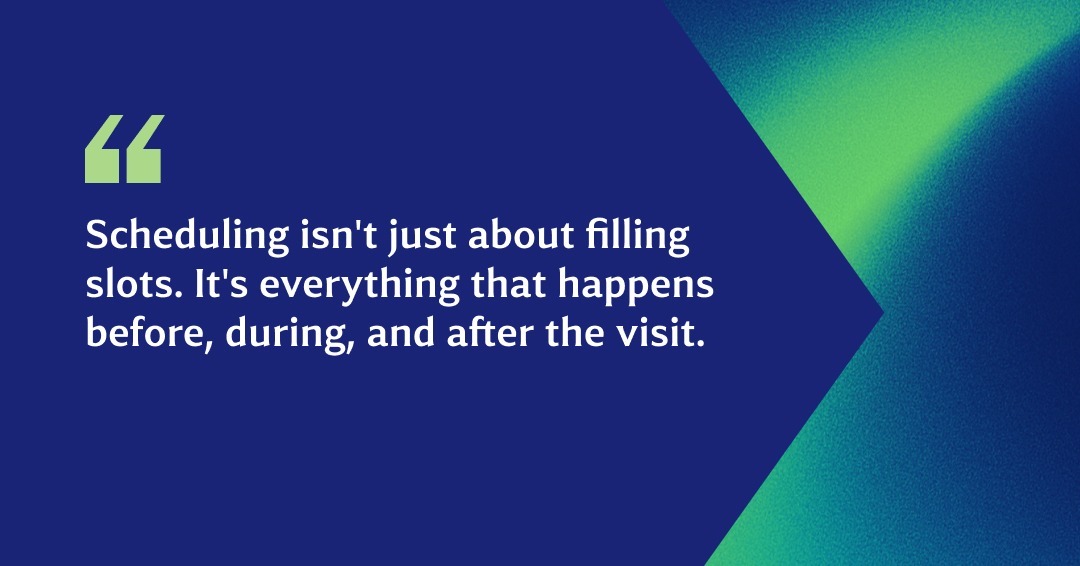 The concept of patient appointment scheduling completely changes when you think about it as a patient engagement function. You ask different questions and take different actions. It's no longer just about filling slots. It's about what kind of experience you're creating before the patient walks through the door.